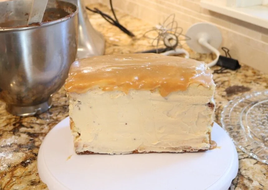 Now, the trick is to let the caramel cool enough that you can spoon it onto the top of the cake…but not so cool that it is too thick to level out,..because if you try to “ice” it on to the top you will pull up the crumb coat.