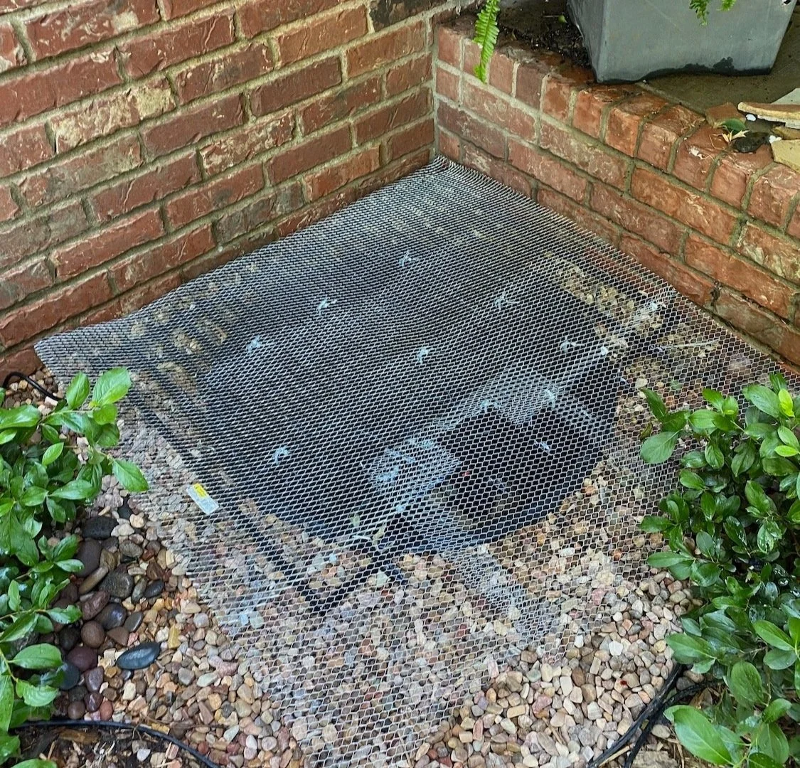 I trimmed the liner back, topped the liner with more pea gravel, put the pump down in the water, reset the grate and rebar and then covered it all with THIS galvanized mesh. This will keep any smaller decorative rocks from falling into the reservoir.
