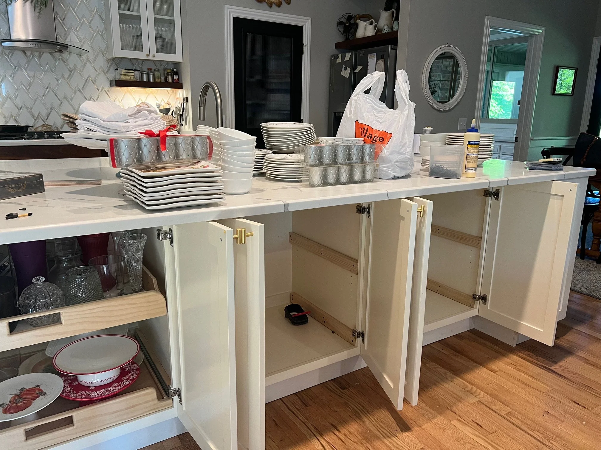 I took a piece of 1/2” plywood and cut two boards the width of the base cabinet (12 3/4”) and 24” long. I used my skill saw to cut a 45 degree edge on one end of each piece. I also took a piece of 1x3” and put a 45 degree edge on each side.